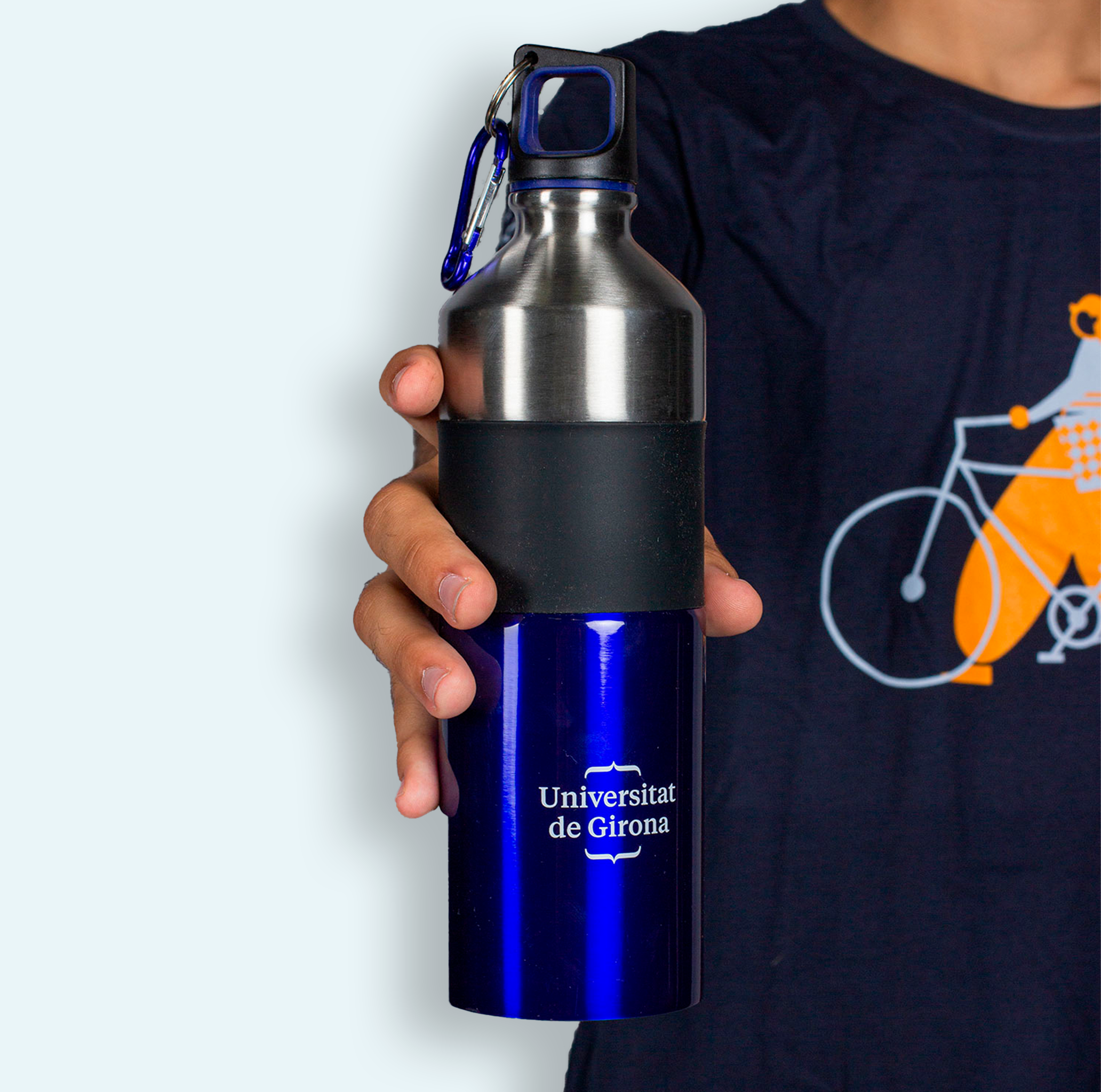 Ampolla inoxidable amb el nostre logo. Part central coberta de goma per facilitar-ne la subjecció.